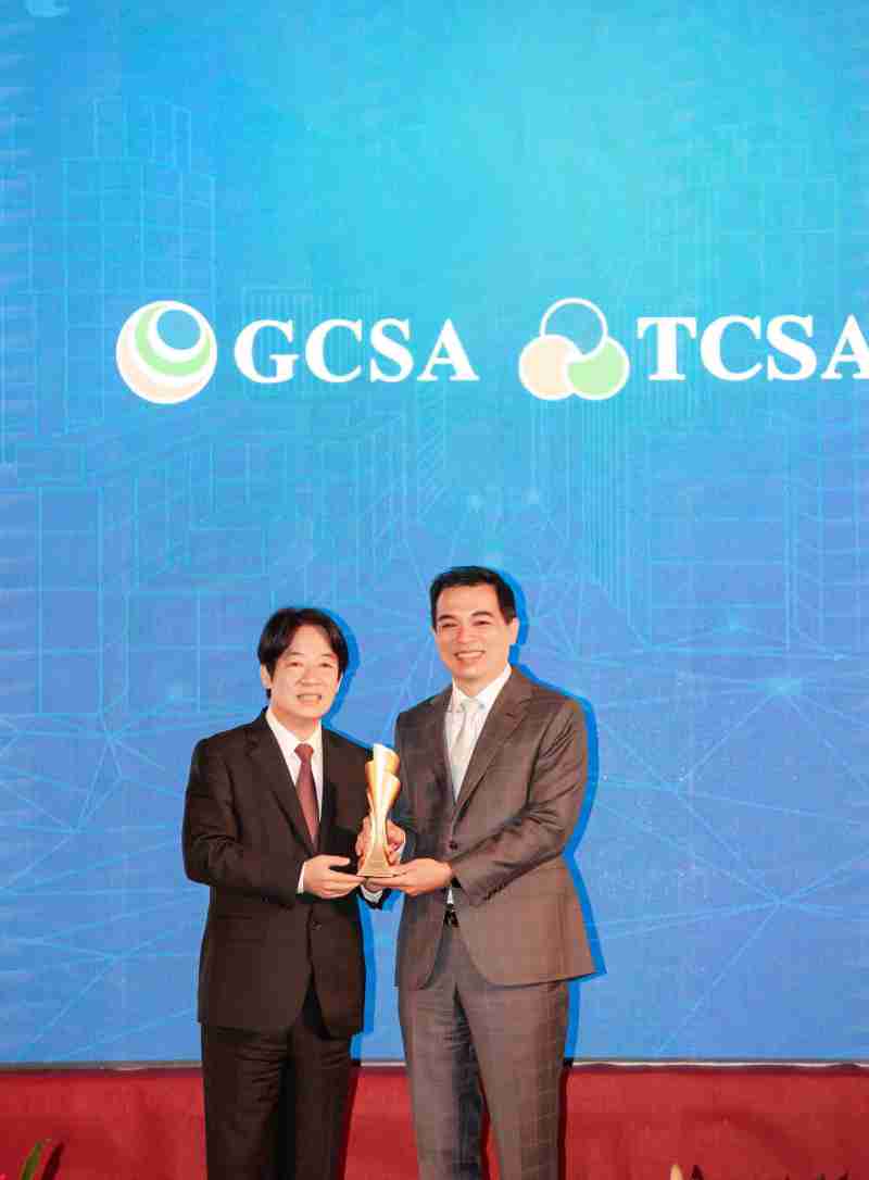 达全方位永续表现获全球永续奖及台湾永续奖肯定,,,,由副总统赖清德颁奖 (左),,彩霸王总经理柯富仁 (右) 代表领奖