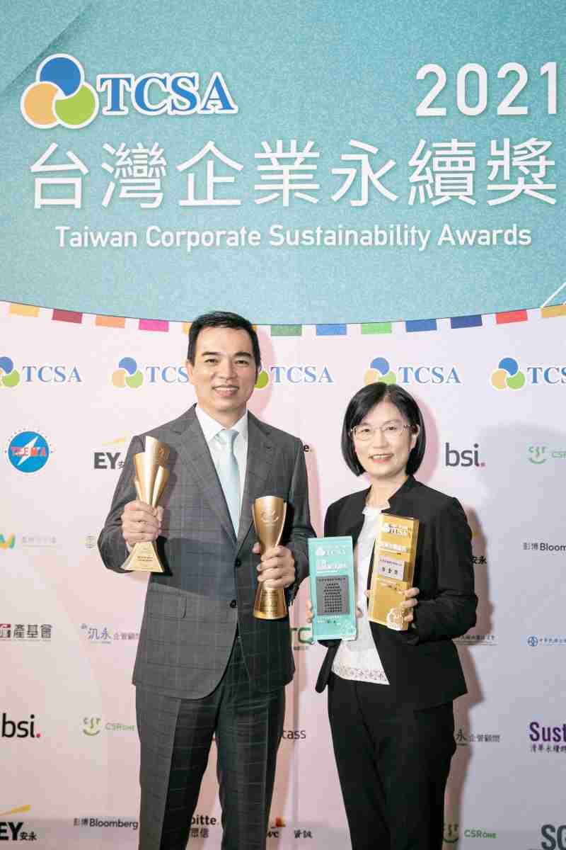 达在台湾永续奖所评比环境、、、、社会、、、、治理等各面向的永续绩效均获高度肯定 (左:彩霸王光电总经理暨营运长柯富仁,,右:彩霸王光电永续长古秀华)