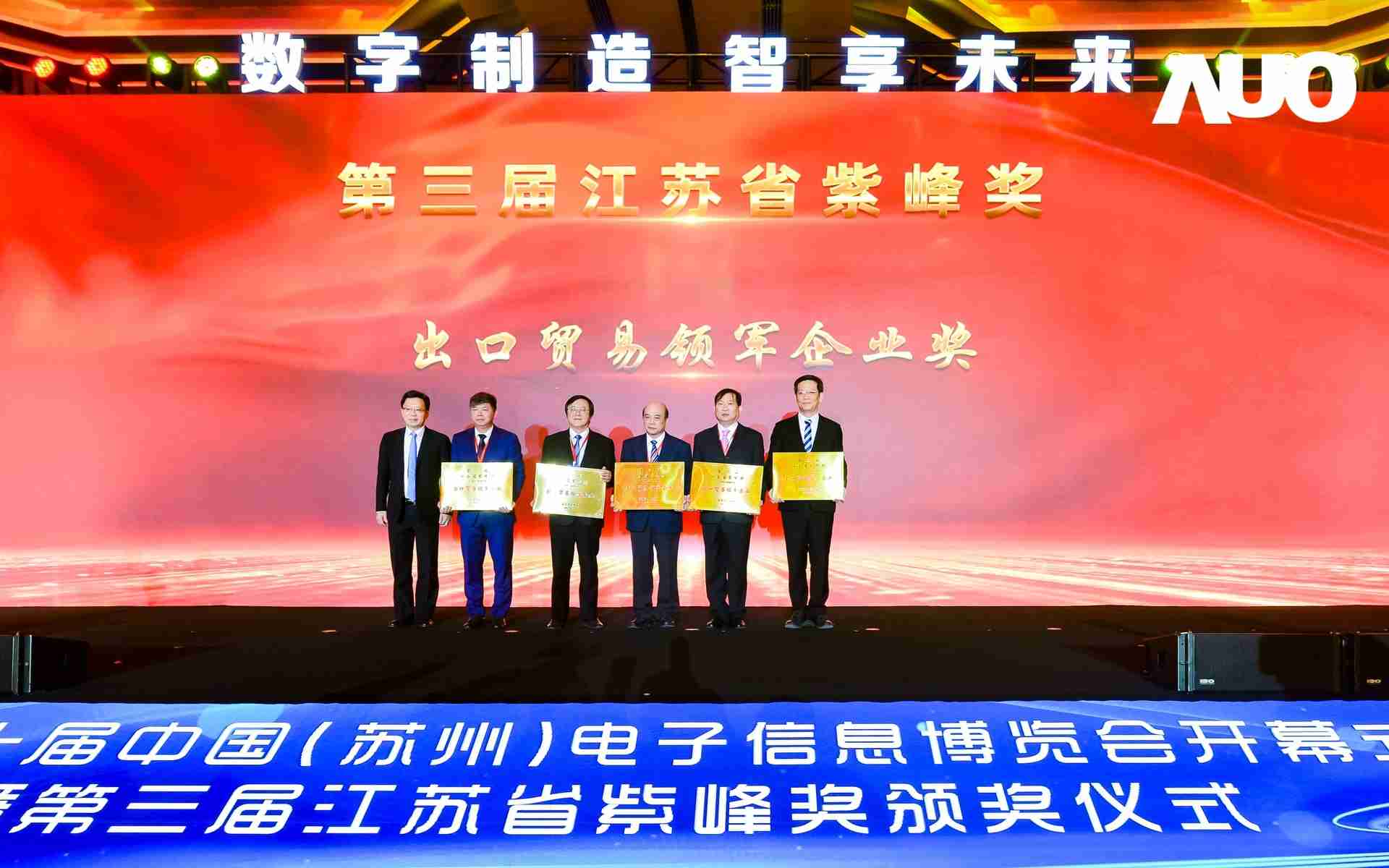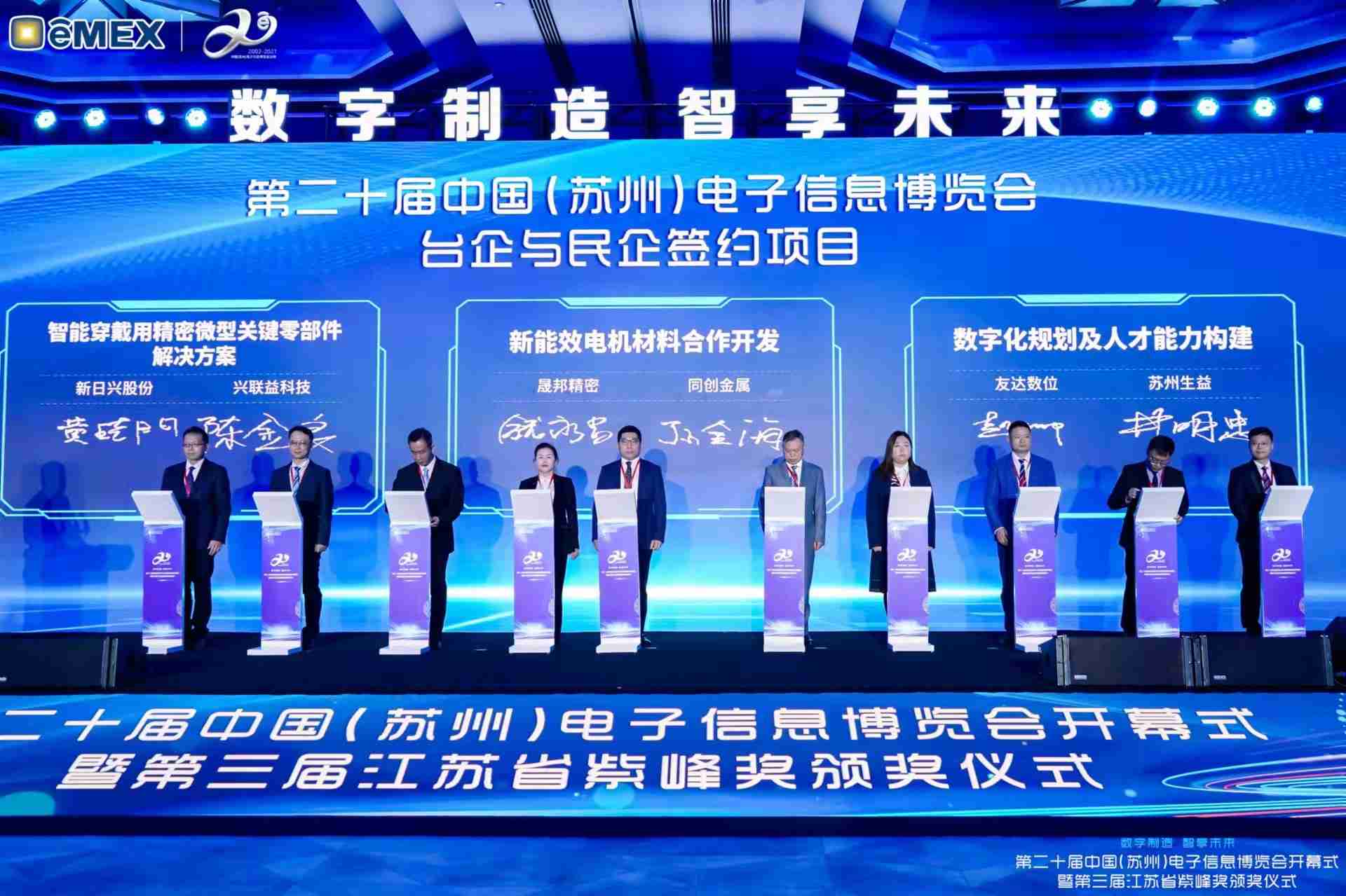 电博会开幕式当天也是第三届江苏省紫峰奖颁奖仪式,,,省台办、、工信厅、、、、商务厅、、、苏州市相关领导均出席并颁奖。。。。该奖项为表彰对江苏高质量发展做出积极贡献的在苏企业,,,由江苏省政府专门设立。。。彩霸王光电 (苏州) 总经理郭振明代表上台领奖,,这也是彩霸王苏州连续三次蝉联紫峰奖 出口贸易领军企业奖。。。彩霸王数位总经理赵丽娜女士,,,也参与本次开幕式,,上台为本地化赋能签署战略合作协议,,将优质服务资源集合、、、下沉到更多细分行业,,,,为更多地区的制造企业提供数字化转型服务。。
