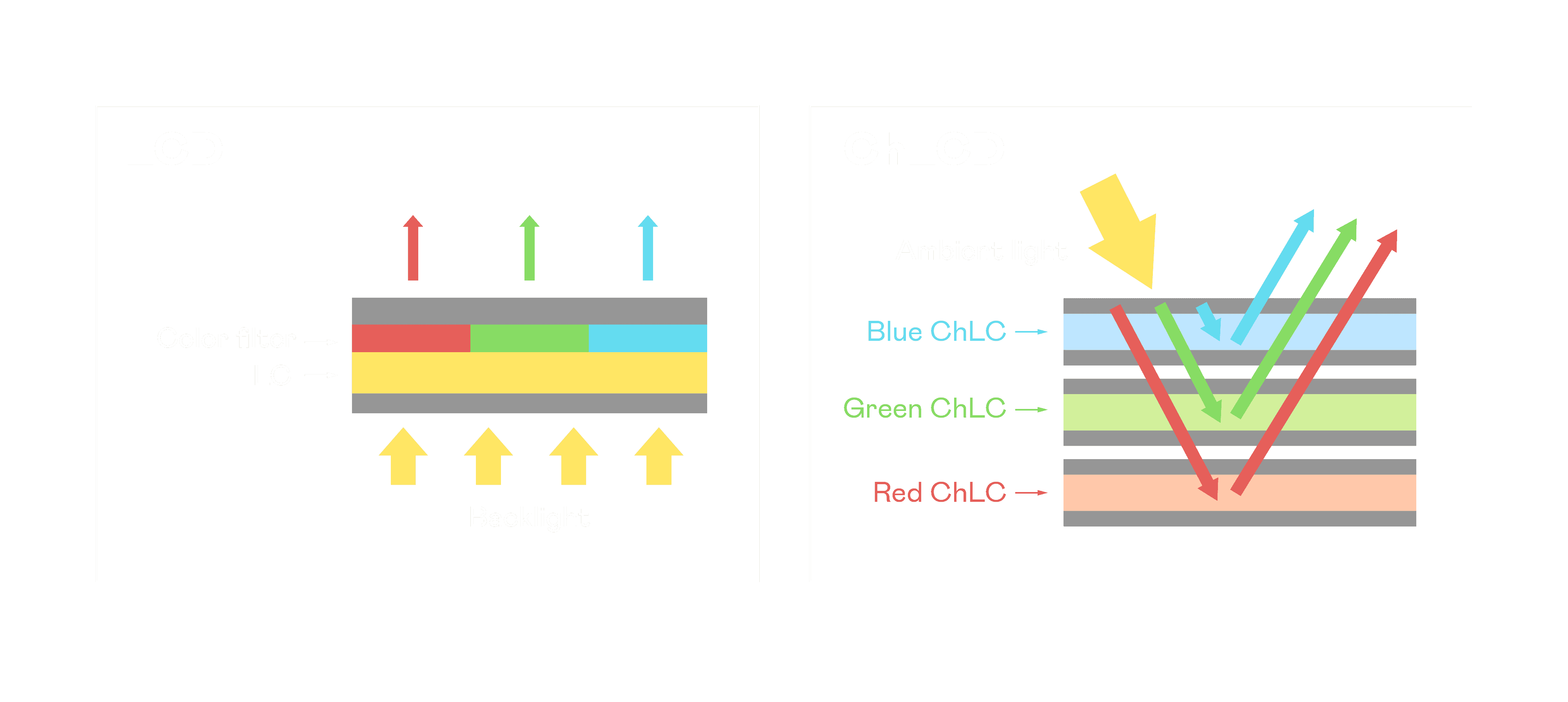 ChLCD 胆固醇液晶就如同纸张一样,,,透过反射环境光来显示影像,,,,因此长时间观看不易造成人眼视觉疲劳,,,可达到护眼效果。。。当处于户外阳光下使用,,,LCD 影像容易失真而不易观看,,,但胆固醇液晶仍可维持较佳的影像品质。。